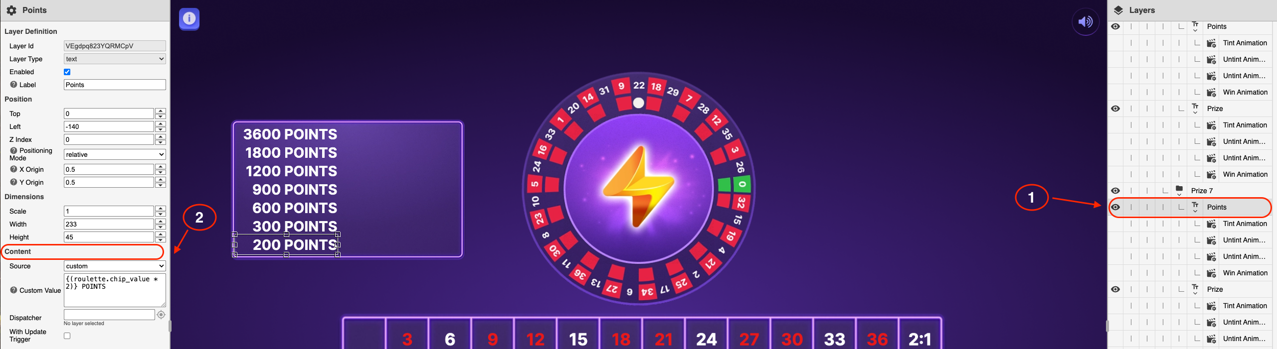 By default, the Source field is set to custom, and the value uses a dynamic variable to calculate the payout:{(roulette.chip_value * 2)} POINTS). The roulette.chip_value is set in Editor > Settings > Game Settings.