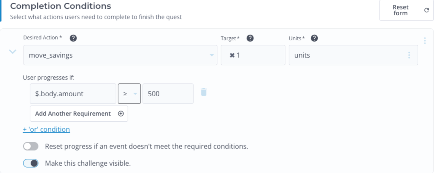 Add Requirement: Use event properties to refine the user action. See the image below for an example quest that requires users to save 500€.