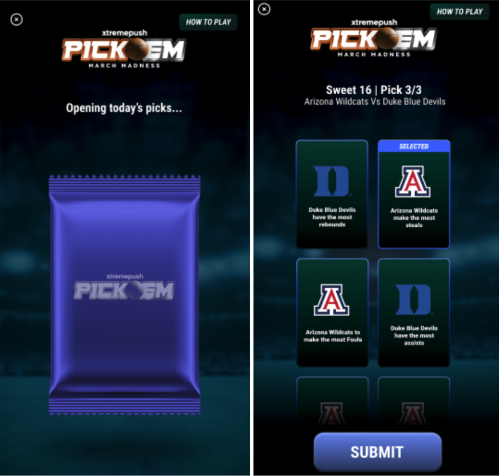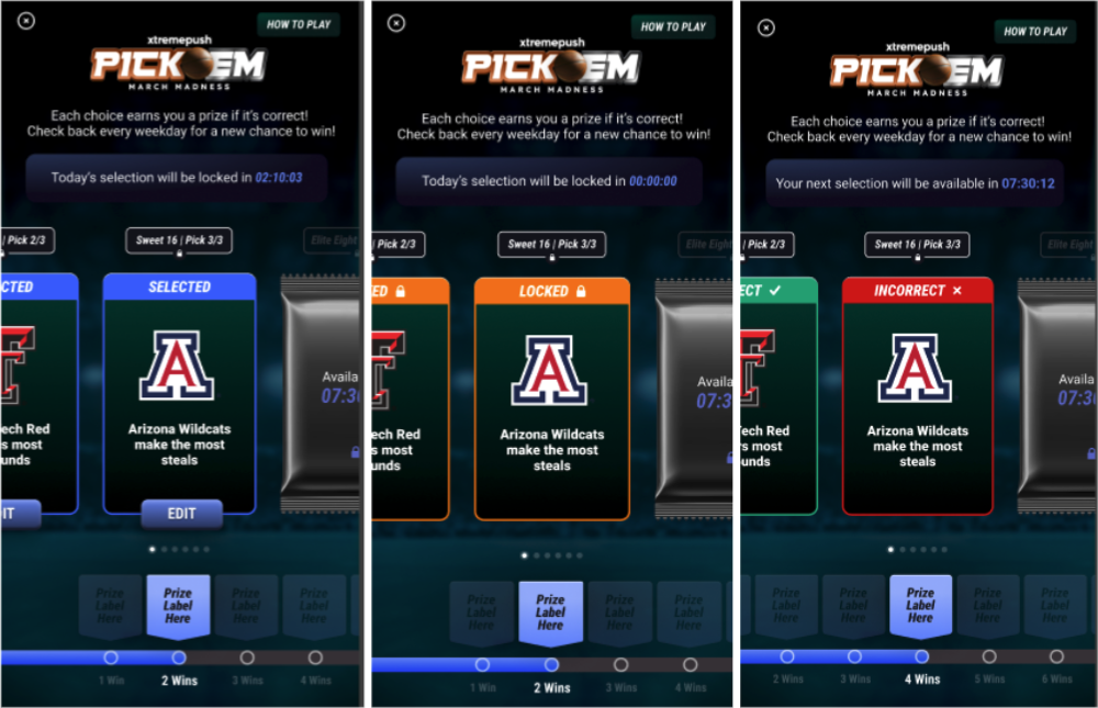 As real world sporting events progress, players can view their progress for each answer to see if their picks were correct as shown in the image below. These updates or player progress can be configured to occur in real-time using the Xtremepush feed or you can update them manually.