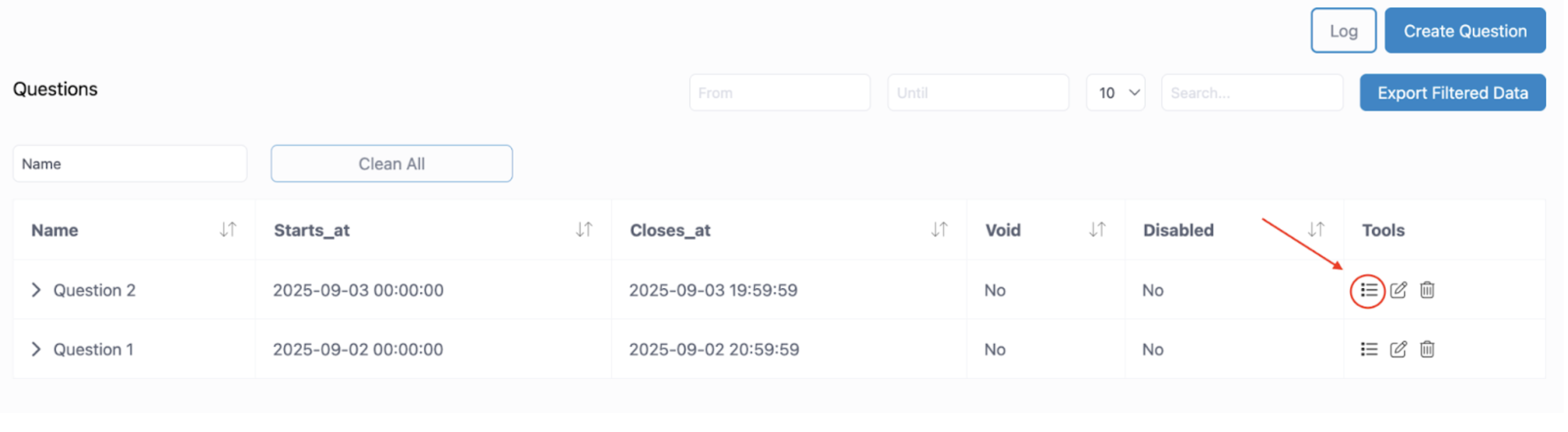 Deleting QuestionsYou can delete a question only if it’s not yet live, meaning its Starts At date of the question hasn’t passed.