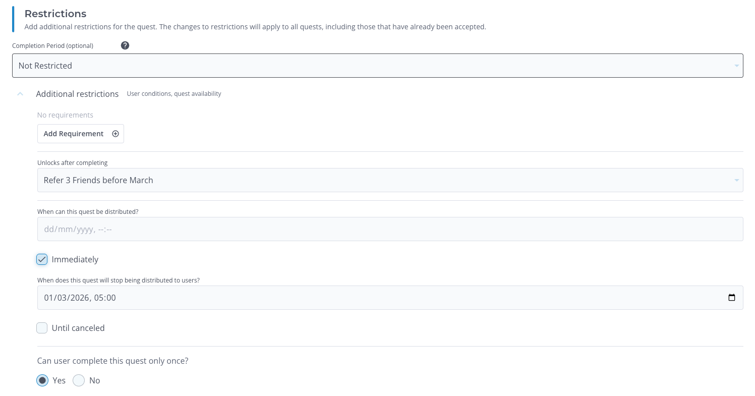 - Set the quest completion date to 1st March as the quest must be completed before March. After this date, the quest is deactivated and no longer visible to users.