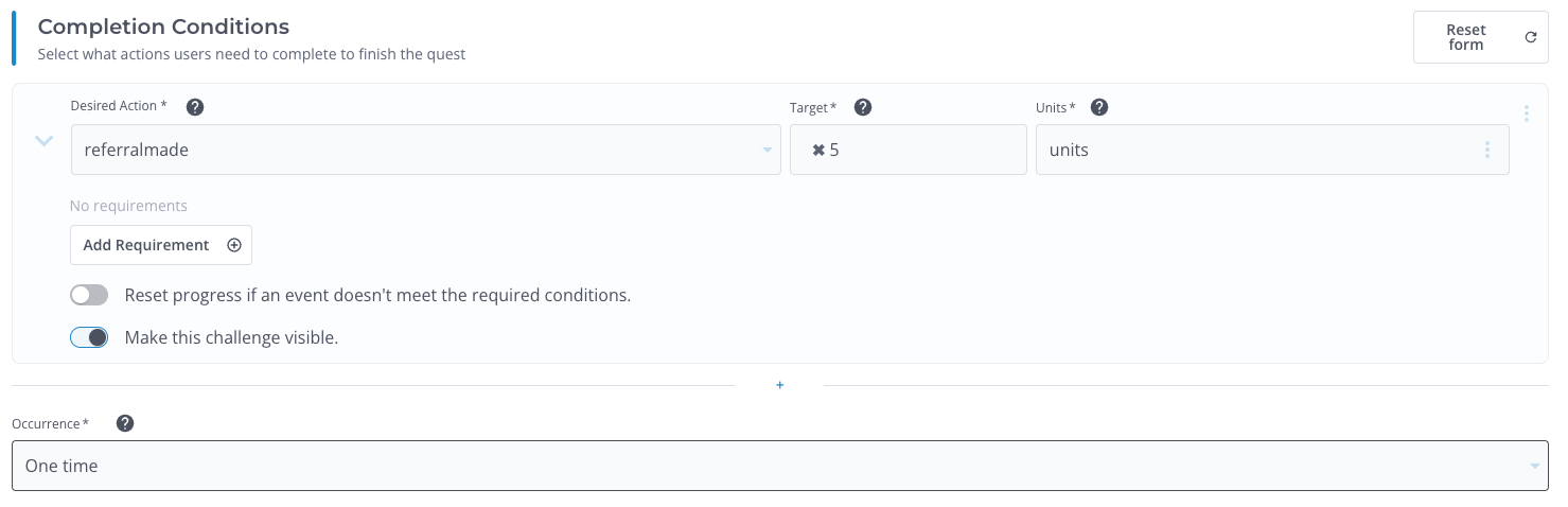 - Occurrence: Set the occurrence to One Time, as the desired action of five referrals, must only occur once.