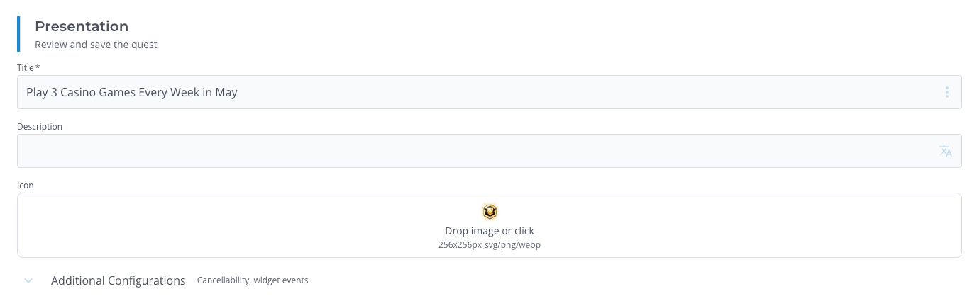 Set the title to Play 3 Casino Games Every Week in May and upload a relevant icon.