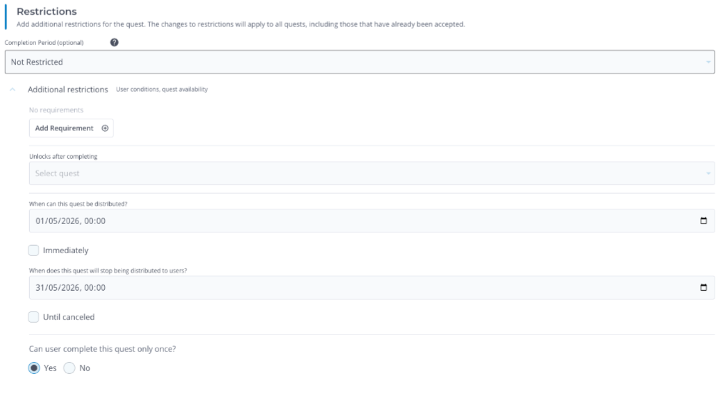 Set the date range from 1 May to 31 May to limit quest availability to that month.