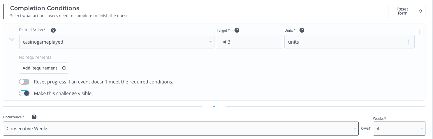 - Occurrence: Set the occurrence to consecutive over four weeks. This further refines the desired action, requiring users to play 3 casino games consecutively over 4 weeks to complete the quest.