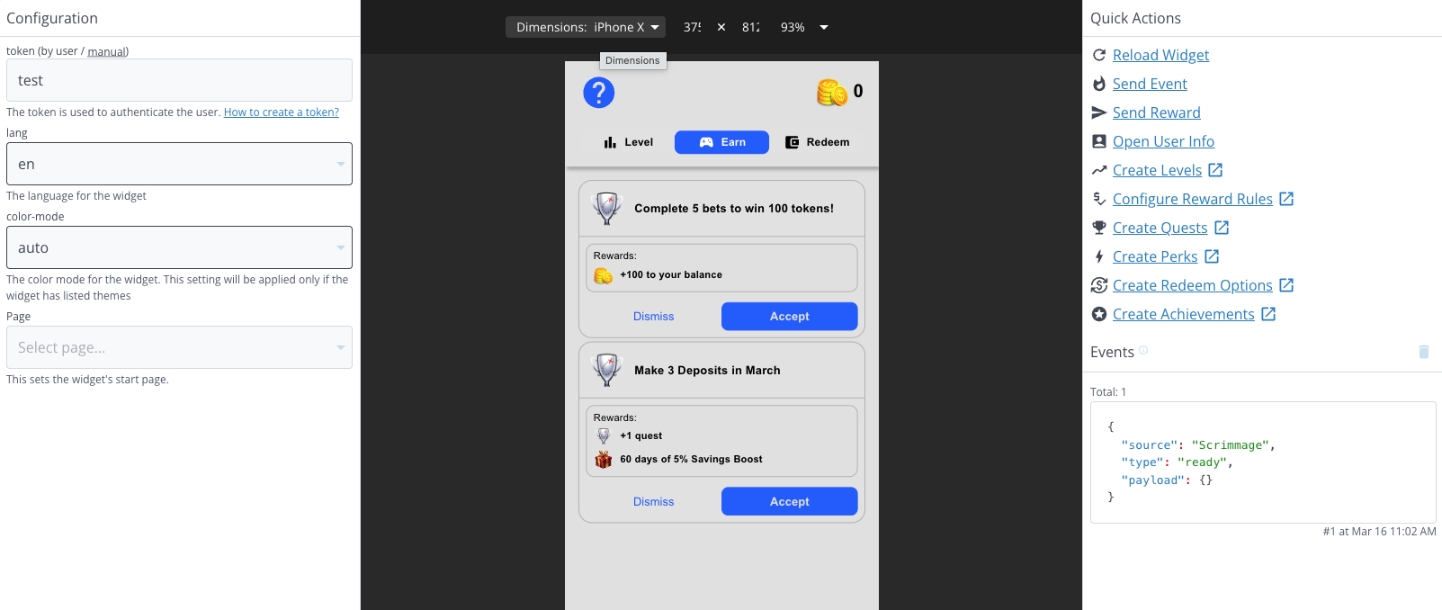 - Send Reward: Allows you to simulate changes to the widget when a user receives a reward. Use this option to test how a reward pop-up appears to a user or how their total tokens and transactions change when they receive a reward.